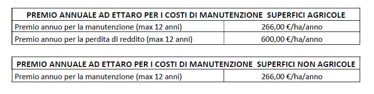 Il premio annuale per ettaro per la manutenzione ed eventuale mancato reddito agricolo sarà erogato in 12 annualità, con inizio dall’annualità successiva a quella del collaudo dell’impianto di imboschimento
