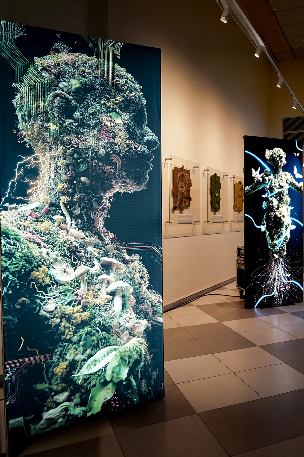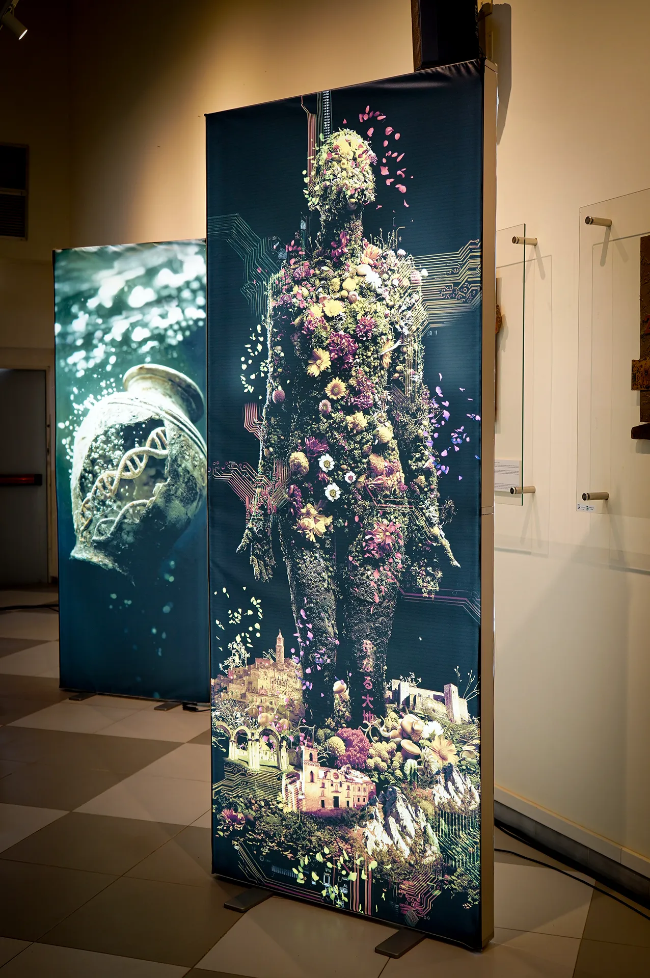 L’istallazione si compone di LightBox luminosi di grande formato, nei quali emergono figure femminili composte di terra, radici, vegetazione, fiori e tecnologie. Corpi che sembrano germogliare e rigenerarsi, metafora di una Basilicata che affonda le radici nel passato e si proietta nel futuro. I petali che si staccano e fluttuano nello spazio evocano il movimento vitale, la rinascita continua, la ricerca scientifica, la sperimentazione chimica in continuità con le biotecnologie vegetali del Centro Ricerche Metapontum Agrobios. Le opere dialogano con il territorio in un equilibrio tra natura e robotica - il Centro di Ricerche Metapontum Agrobios dispone di una piattaforma robotizzata di analisi d’immagine ad elevata efficienza per il fenotipo delle piante (plant phenomics), definita “unica in Italia e tra le poche al mondo”. Una delle opere presenti, realizzata appositamente per il Comitato di Monitoraggio, raffigura un antico vaso della civiltà greca immerso nei mari di Metaponto, al cui interno si scorge un filamento di DNA.